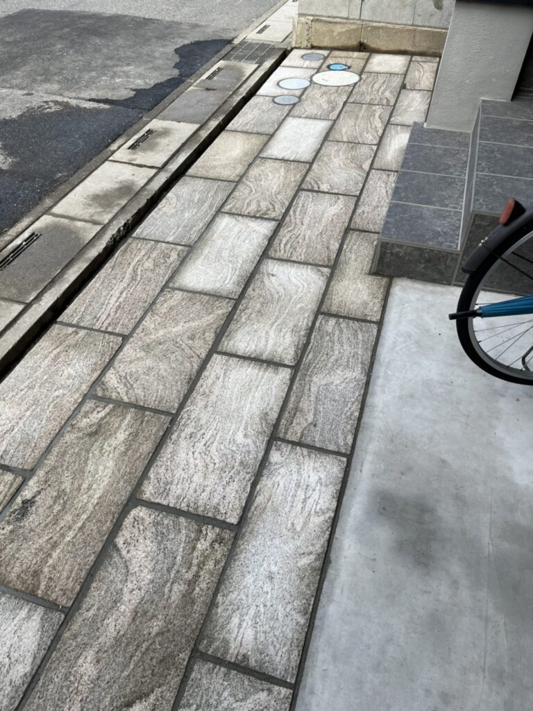 施工内容は入口部の石張り、外周のフェンス設置 建物の両脇の土間コンクリートと裏庭の人工芝を行いました(^^)